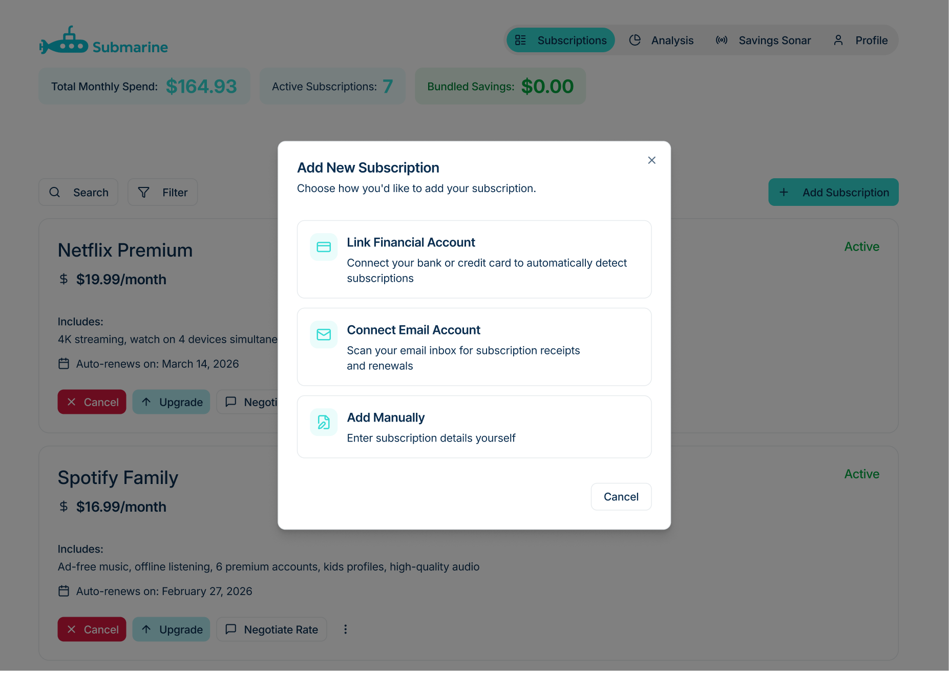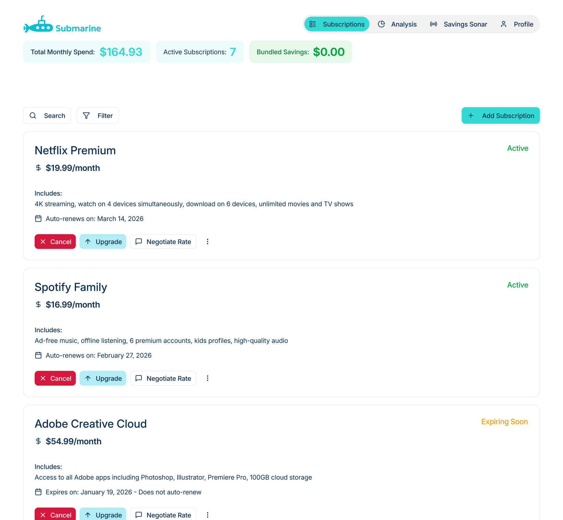 Below is a quick prototype built using Figma Make. It only took a couple hours to produce, but has a full end-to-end UX for the landing page for the subscription manager, along with a sign in, add subscription, manage subscriptions, and savings screen.